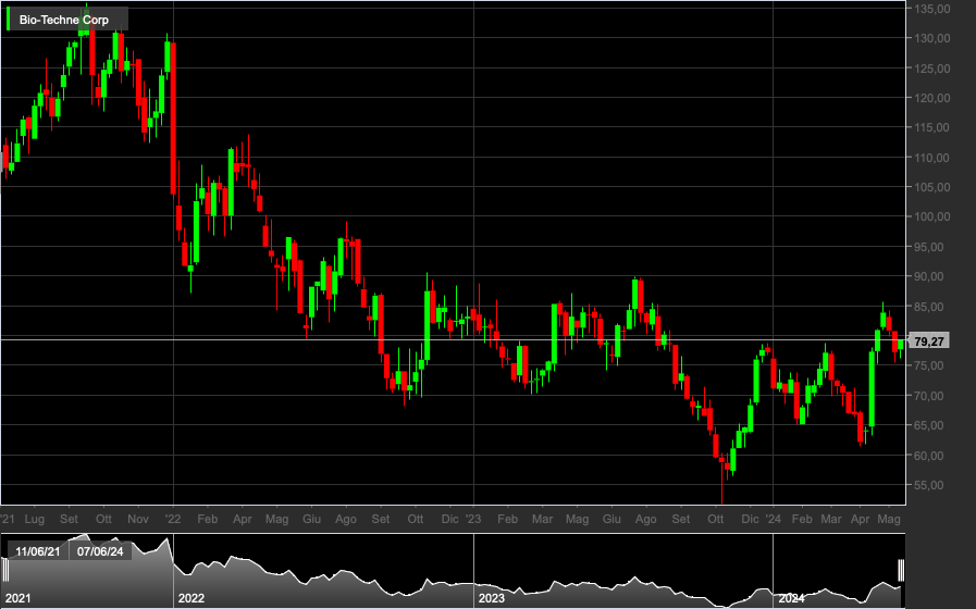 After reaching highs in 2021, the stock experienced three years of significant downtrend, until October 2023, when it appears to have reached a low level, corresponding to the low prices of 2020, around $60. From that point, TECH stock recorded a 40% increase in the stock market, once again capturing the interest of investors. With a P/E ratio of 62 and an operating margin of 23%, TECH becomes a very risky but attractive solution for lovers of speculation.