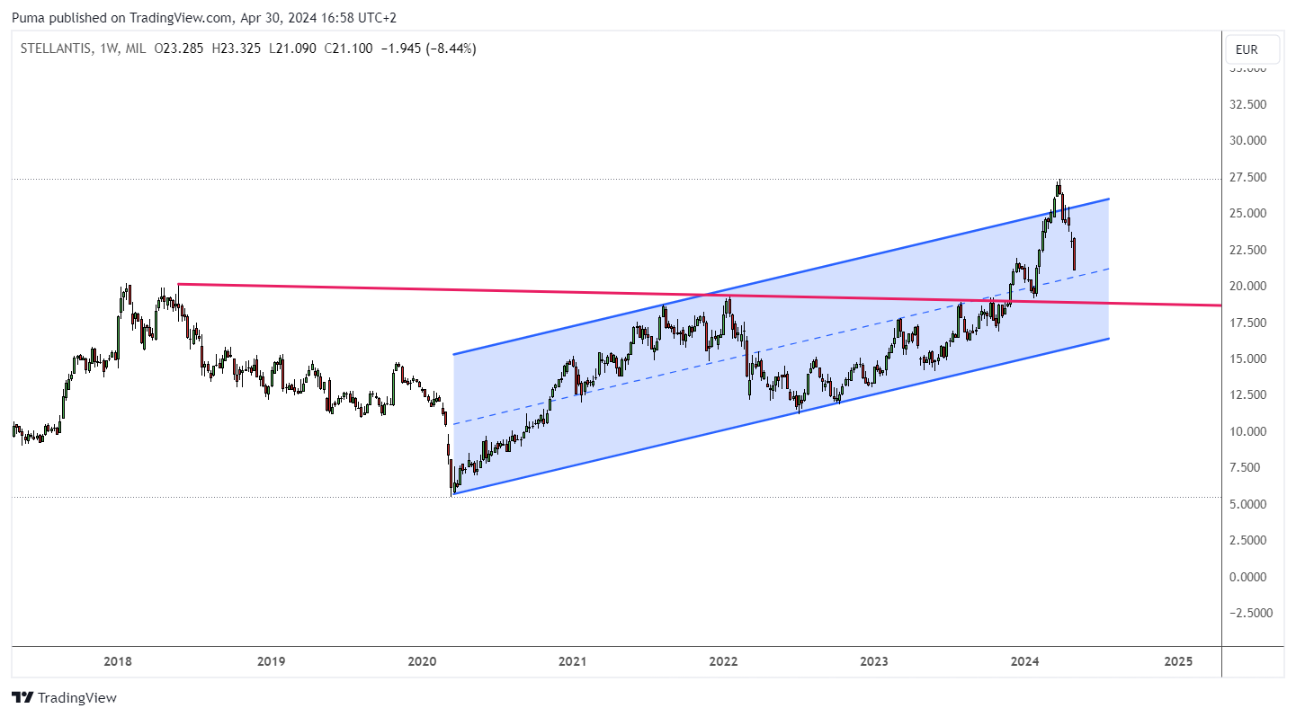 Stellantis is one of the European shares that have been chosen by Goldman Sachs. The bank recommends buying the stock with a target price of 28 euros, as they believe there is potential for growth. However, the stock lost over 9% after the quarterly results were announced on Tuesday, 30 April. The Franco-Italian automaker, which owns popular brands such as Peugeot, Fiat, Jeep, and Alfa Romeo, saw its net revenue decline by 12% in the first quarter of 2024, falling to 41.7 billion euros, below analysts’ expectations of 42.6 billion euros.
