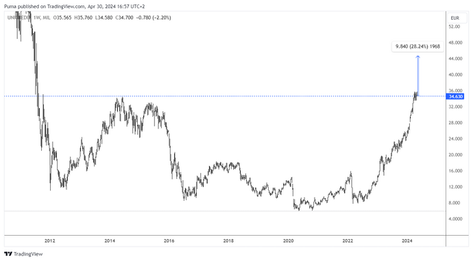 UniCredit is one of the most interesting European shares to hold in your portfolio until 2025, according to Goldman Sachs. With a target price of 44.70 euro, the Italian banking giant offers growth potential of 28% compared to current levels. This positive outlook is based on solid fundamentals and a robust business model that could thrive even in a lower interest rate environment.