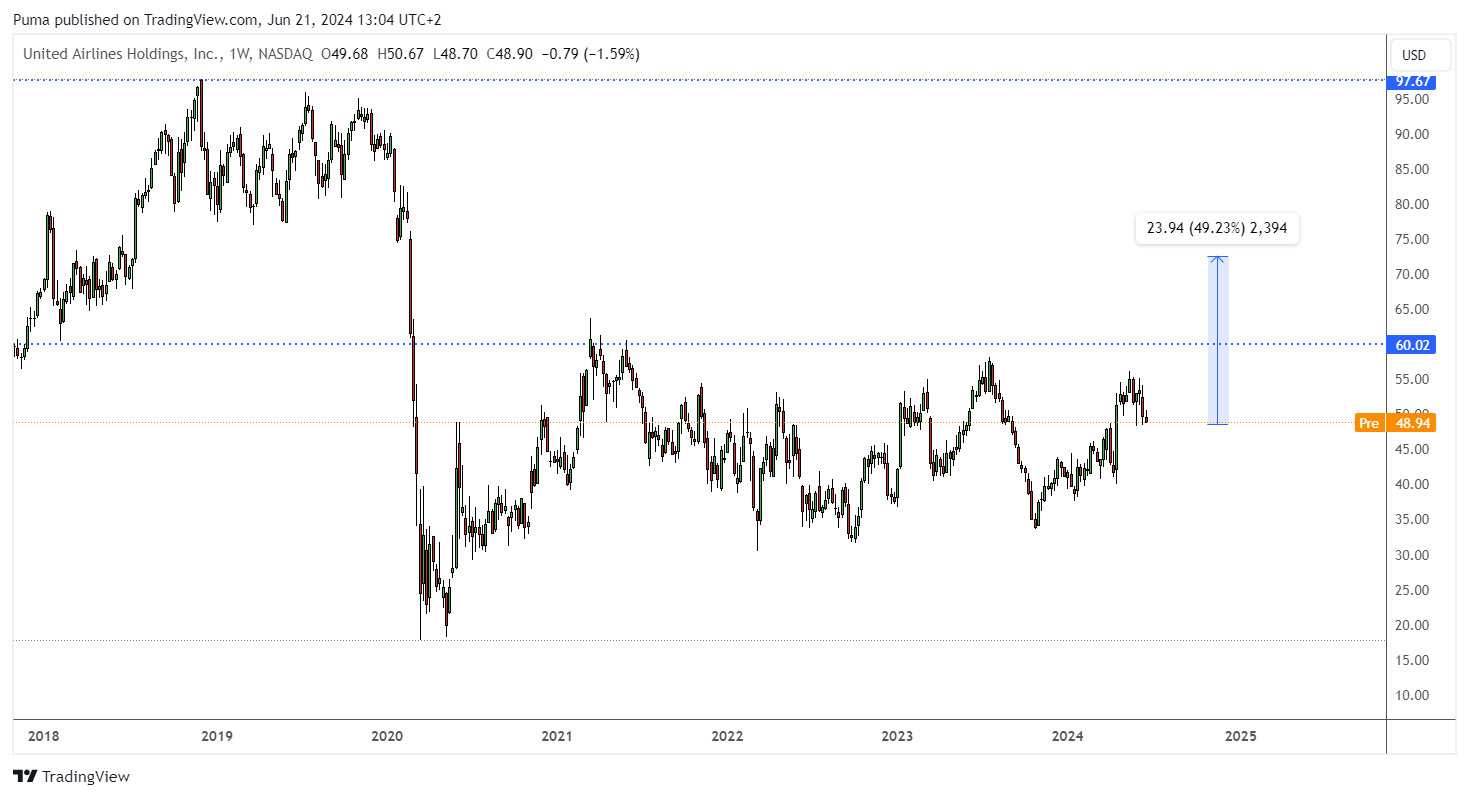 United Airlines Holdings (UAL) is another stock that analysts expect to outperform in the second half of 2024. While the airline industry has faced significant challenges in recent years, United Airlines has shown signs of recovery with a 19% increase in 2024 and a forecast of a 47% upside over the next six months.