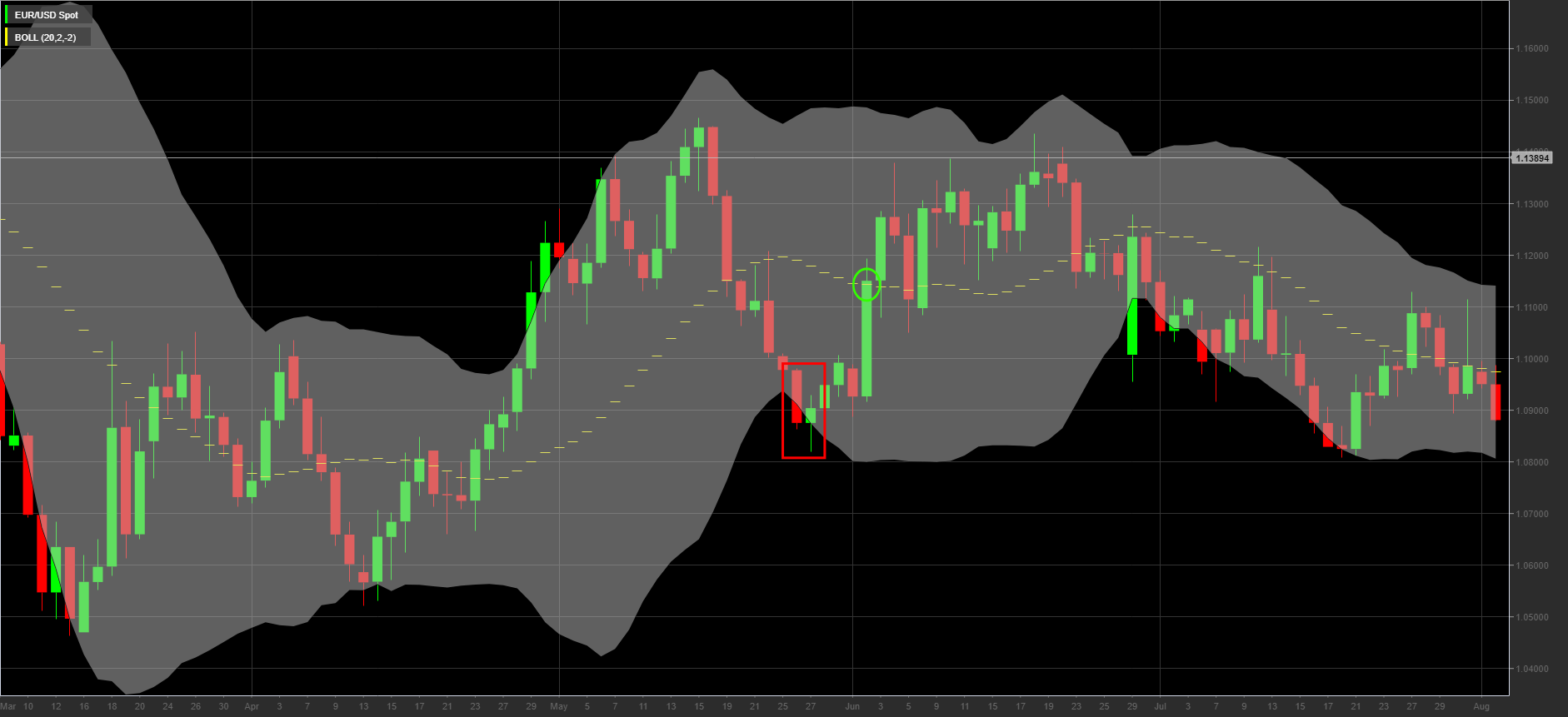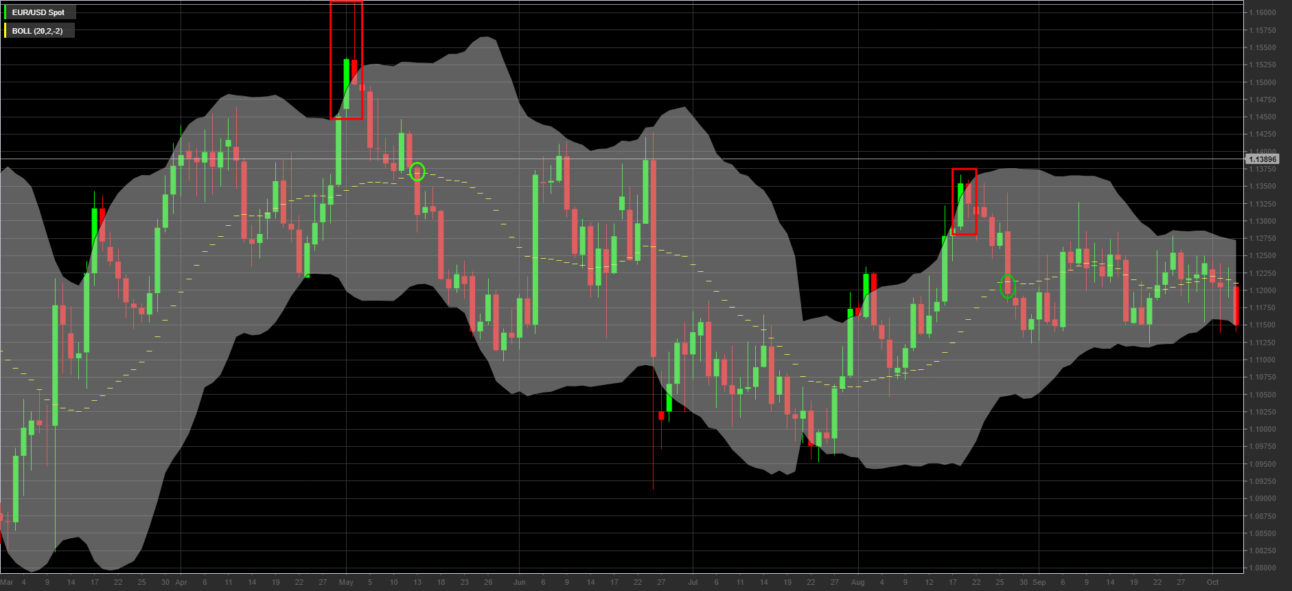 The upper band and lower band function as dynamic support and resistance areas. In essence it is as if they indicate phases of overbought and oversold.