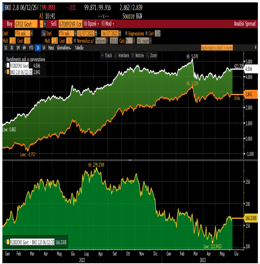 In the Bloomberg chart below we can observe, from January 2022 to today, the parallel trend of the 2-year yields of the US Treasury and the German BUND. In the graphs below is the size of the US-GERMANY spread on the 2-year government bond.