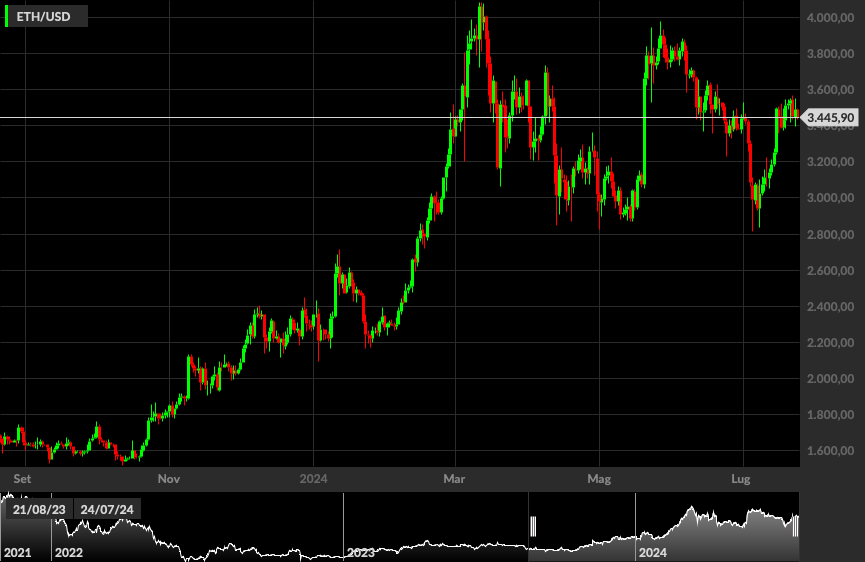 From a technical perspective, Ethereum shows some resistance in breaking key price levels despite the good news on the ETF front. Even from a volumetric point of view, there seems to be a lack of volume levels that would make breakouts technically relevant; at the same time, the RSI oscillator on a daily timeframe remains in neutral territory.