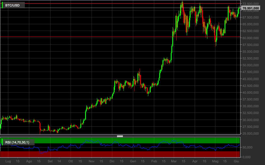 Looking back at the history of Bitcoin, we can see that breaking key resistance levels often leads to significant price increases. This is especially true during times of high enthusiasm, like the period following the halving event and the introduction of new Bitcoin spot ETFs. The possibility, in the near future, of an introduction of passive investment solutions on ETFs listed on regulated markets makes this breakout a technical element to be carefully evaluated.