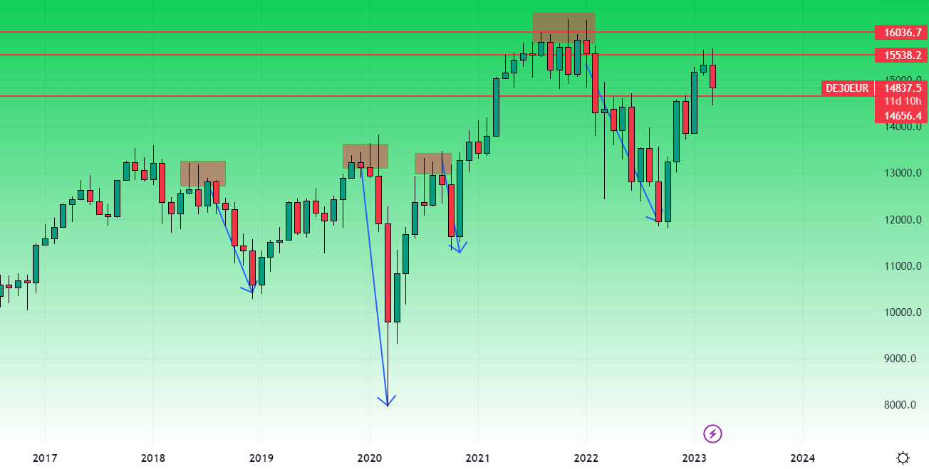 The first thing to do in these cases, when we have to examine market movements that have continued over time, is to choose a long timeframe (i.e. a temporal reference). In this case, as we see in the image, we have taken the trend of the Dax on candlestick chart with 1 month timeframe, i.e. each candlestick we see represents 1 month of trading.