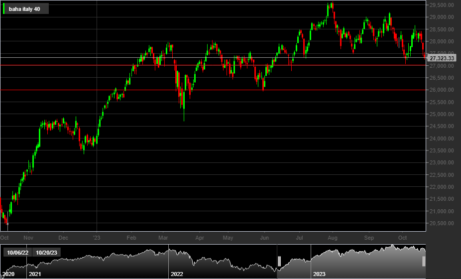 Friday’s close brings the reference index of the Italian stock market close to the lows of October, a technical level whose breakdown would open the doors to uninspiring bearish scenarios. Many observe with concern the target of 26,000 points, an area of particular graphic and historical relevance for the index. It should be borne in mind that this week’s contraction appears to be mainly due to a situation of substantial global uncertainty rather than a concrete situation of difficulty. Based on this premise, it could be interesting to observe how demand will react near the lows, perhaps signaled by oscillators such as the RSI.