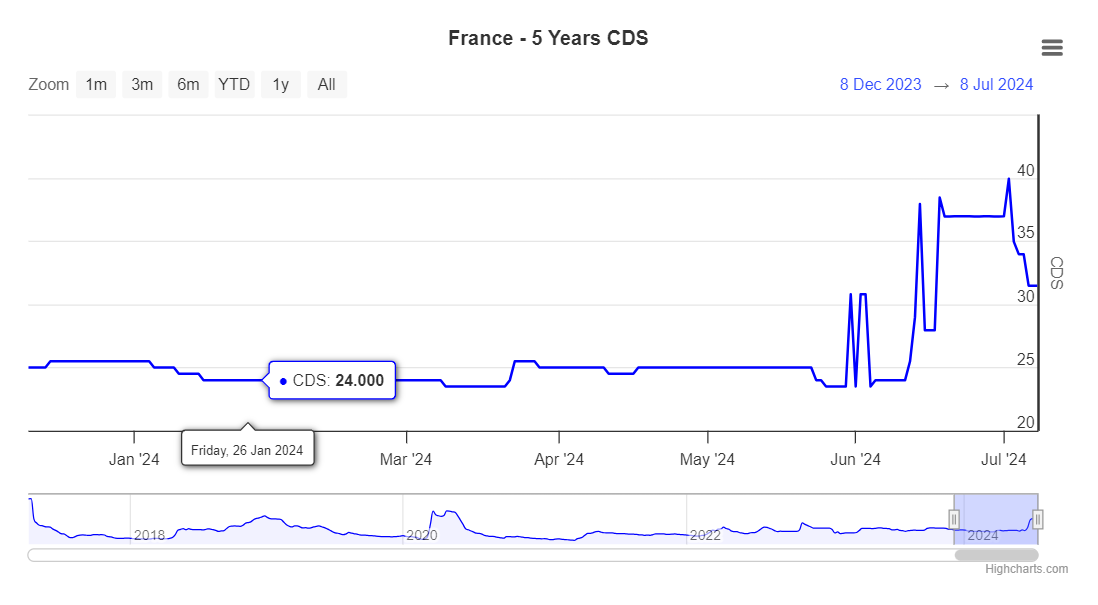 Political uncertainty is reflected in the French bond market yield curve, highlighting an uncertain economic picture and pressure on debt. The value of the French 5-year Credit Default Swap (CDS) is currently 31.47 basis points, indicating an implied probability of default of 0.52%, based on an assumed recovery rate of 40%. This metric highlights the perceived risk associated with French sovereign debt.
