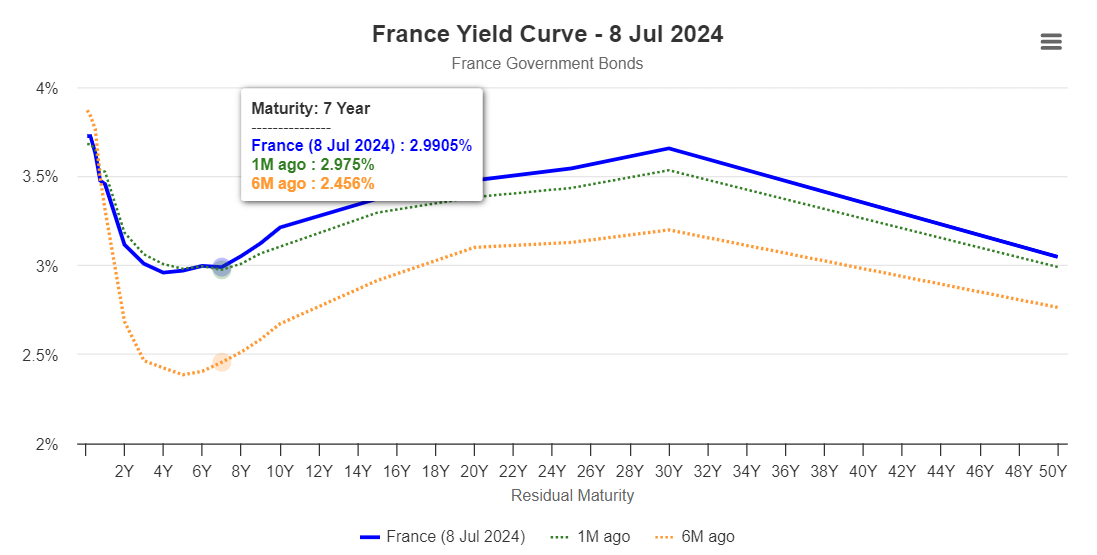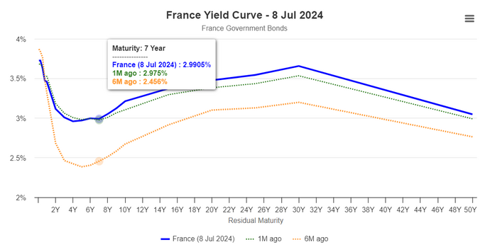 After the elections, yields on long-term French government bonds (from 10 years onwards) rose, signaling that investors are pricing in turbulence and prefer to lighten their positions.