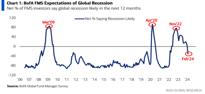 Financial markets are starting to think that the “no recession” scenario may have better chances now than before. Global fund managers surveyed by Bank of America do not expect a recession in the next 12 months for the first time since April 2022: