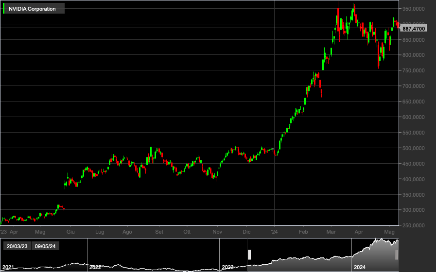 Looking at the artificial intelligence market, a first point of reference for the sector is, without a doubt, the company NVIDIA, whose share price, compared to the lows of the year, has grown by almost 90%. The price contraction recorded starting from the first days of April proved to be a flash in the pan and, after a 20% drawdown compared to the highs, the company’s share price began to rise again, surprising many. SIi expects the company’s earnings to be reported on May 22, so the market will have to wait a little longer to see if fundamental expectations will confirm the share price growth. In any case, the stock markets expect triple-digit growth in profit, definitely one of the most promising estimates among those of the Magnificent 7, which on average expect growth above 30%, according to Bloomberg data. Being the share of the AI sector with the largest capitalization, the strong upward push in price has driven the various indices and funds, and in fact, it continues to be one of the best-performing periods for the latter.