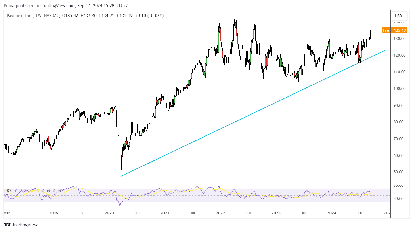 Paychex has been growing steadily since 2020 and after the last Fed rate cut without a recession, it increased its stock price by 51.5%. The American human resources and payroll management company has a long history of growing profits and expectations for the next quarter are equally positive.