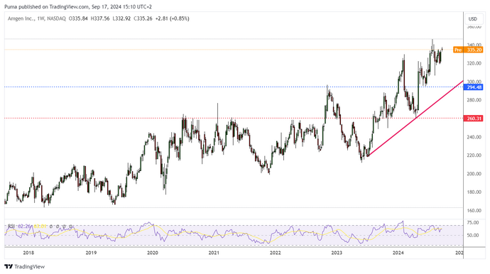 Amgen shares have instead achieved a positive performance of 16.70% since the beginning of the year, with a long-term bullish trend that culminated in May with new all-time highs at $346.