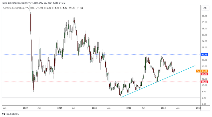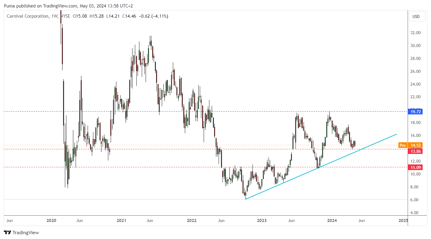 With higher rates, consumers may be less inclined to spend large amounts on vacations, particularly due to rising credit card costs. This could lead to greater pressure on the shares of Carnival and other companies in the sector. However, last Thursday, Carnival reported encouraging financial results, with quarterly revenue increasing more than 40% and an operating profit of $384 million, compared to an operating loss of $1.135 billion in the same quarter a year earlier. These results could indicate a recovery in the cruise industry, but interest rate uncertainty remains a significant risk factor. In any case, a rate cut would be a positive element for the stock.