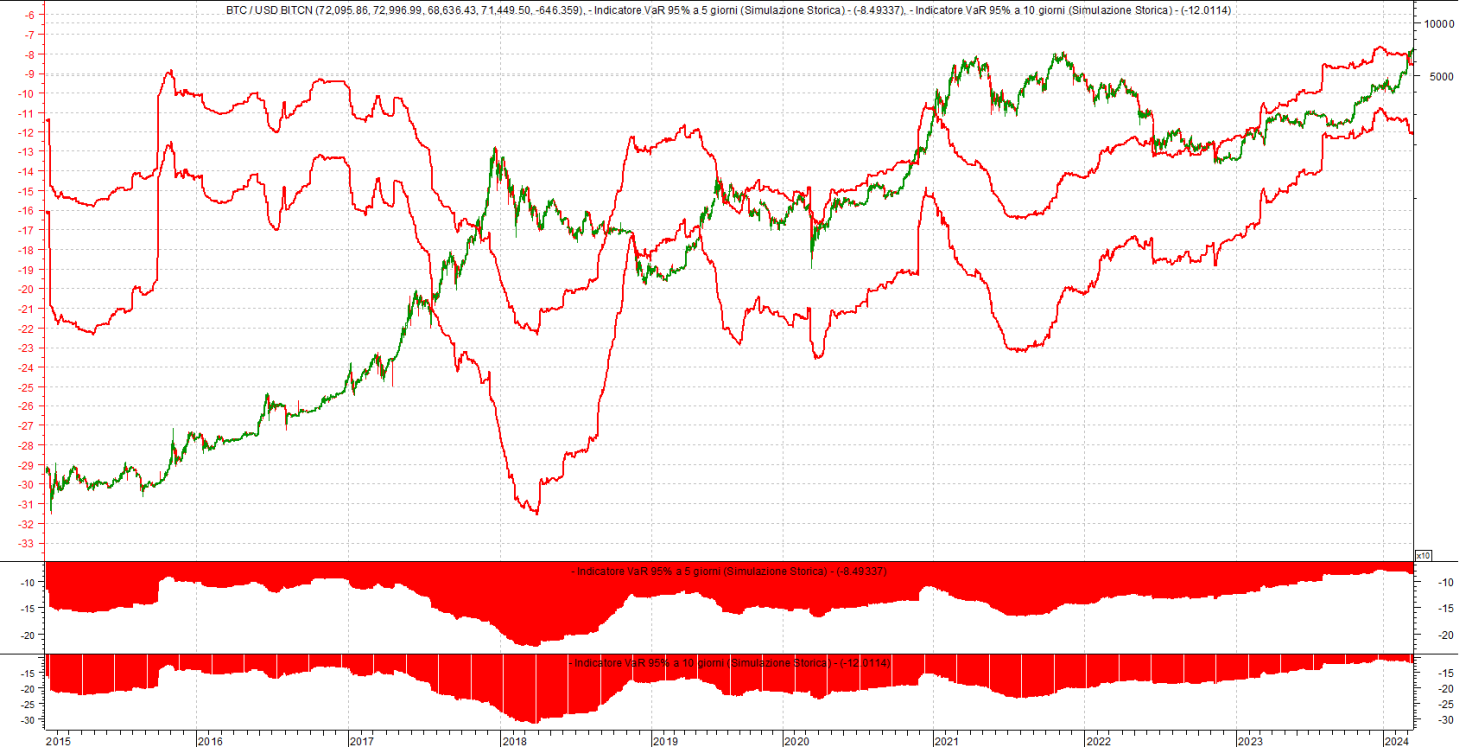 By taking its usefulness to the extreme, VaR tries to satisfy (ex-ante) the need to know the quantum of a possible loss within a specific time frame. Here, now, the only certainty of Bitcoin has been revealed. In the event of a drop in prices, the current VaR values (calculated with a confidence level of 95%) estimate a potential loss of over 12 percentage points if weighted over ten days, while a drop of more than ’8% in case of a five-day horizon.