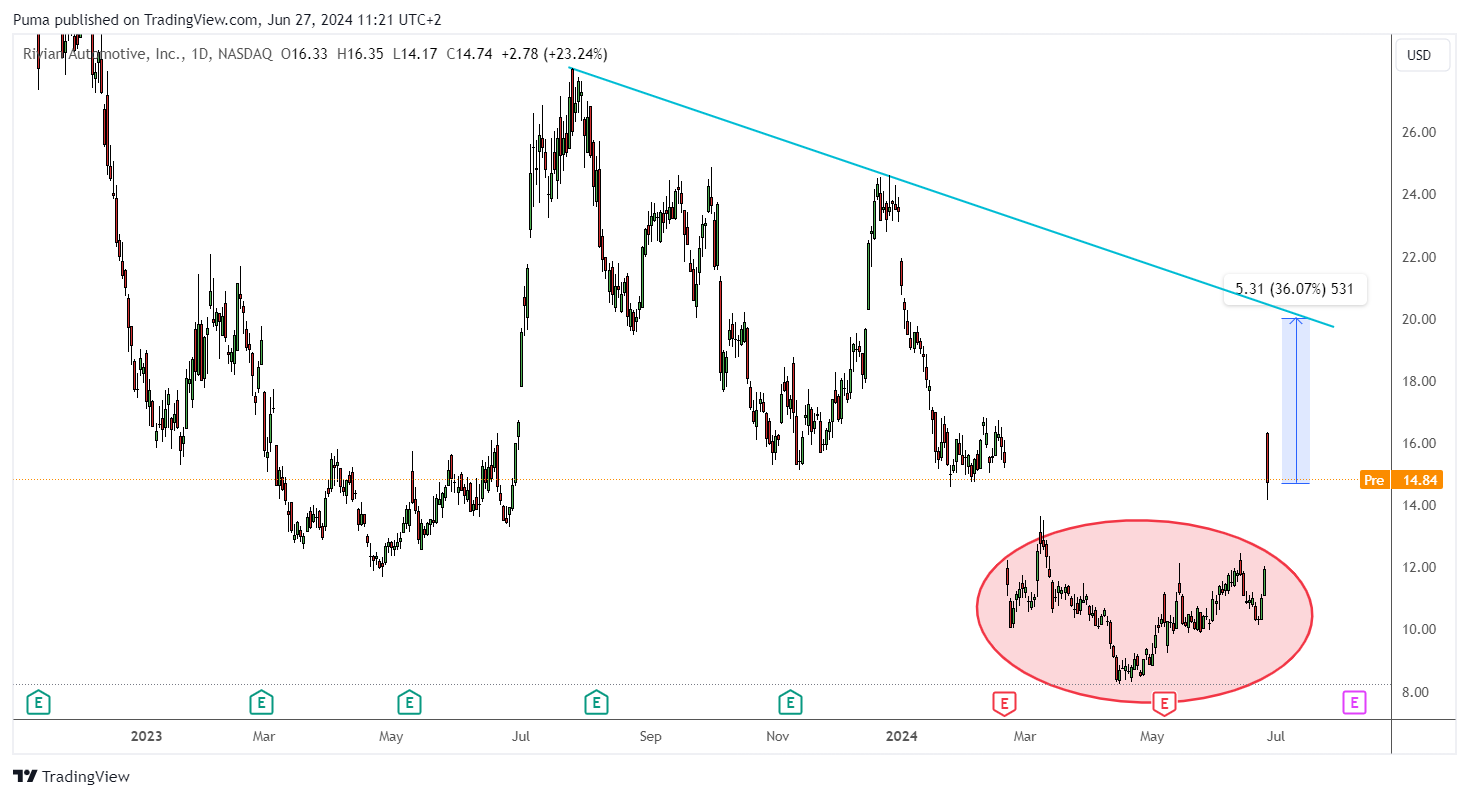 The stock graph is characterized by a rapid decline in prices, fueled by a bearish gap in February, until reaching the April lows in the 8.30 area, and by a subsequent change in trend, culminating in a bullish gap on 26 June. From a graphic point of view, therefore, Rivian has all it takes to extend the momentum toward the indicated objectives.