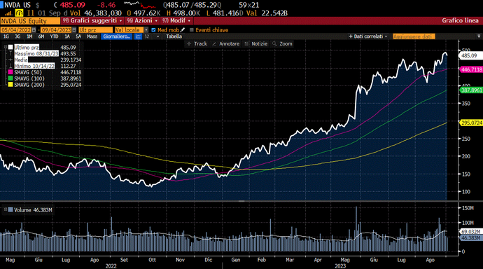 Even graphically, if we look at the Bloomberg chart at the beginning of the article, the stock travels abundantly above its MM200d, equal to $295, i.e. above its long-term trend, and steadily above its MM50d, equal to $445, which is the short-term trend line, with rallies characterized by large trading volumes, confirming that violent bullish movements are supported by large investor participation.