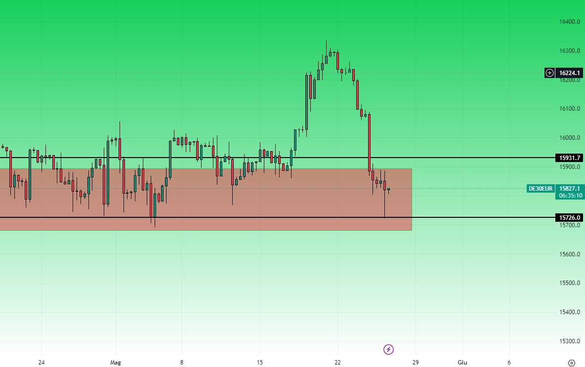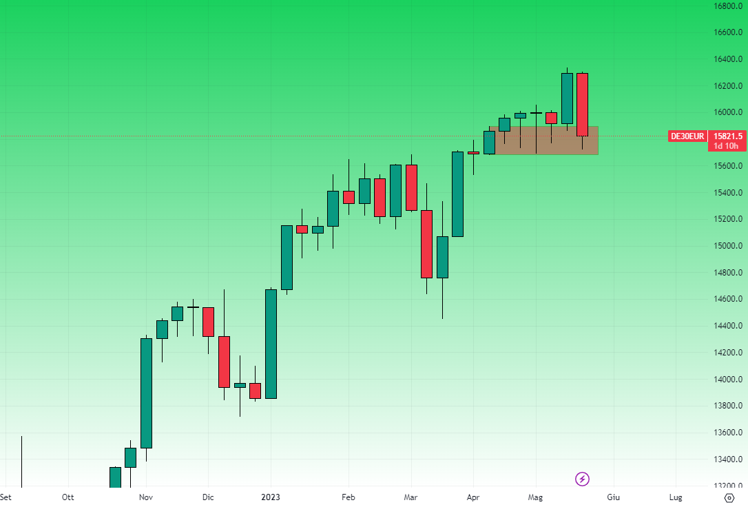 The situation on the markets is paradoxical, i.e. most of those who denigrated the long-term bears last week find themselves speechless by a simple market retracement, something absolutely physiological considering the strong bullish dynamics seen last week, moreover on the market peaks. A small movement like that of the Dax this morning is enough to put fear again on the market which is currently very focused on the issue relating to the debt ceiling in the US, an issue that has not found any resolution at least for the moment.