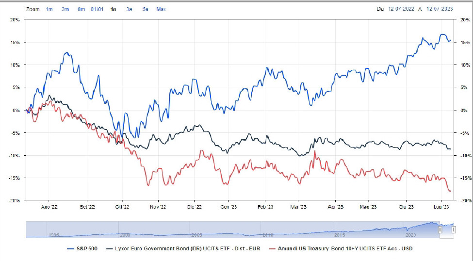 But look at this graph: the blue line is the S&P500, the red represents the 10-year US government bonds and the black represents the euro area government bonds.