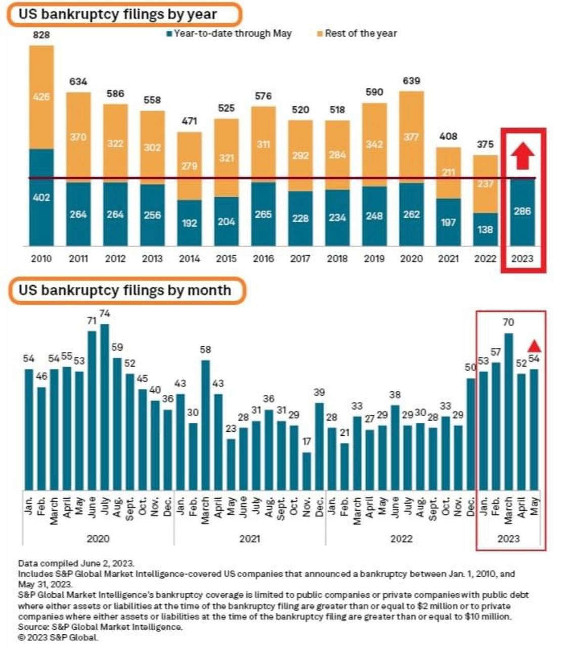 Corporate bankruptcy reached a 13-year high as the S&P 500 Global Market registered 54 failures in May alone. In 2023 alone, 286 firms filed for bankruptcy up from 138 in May 2022, a 56% increase.