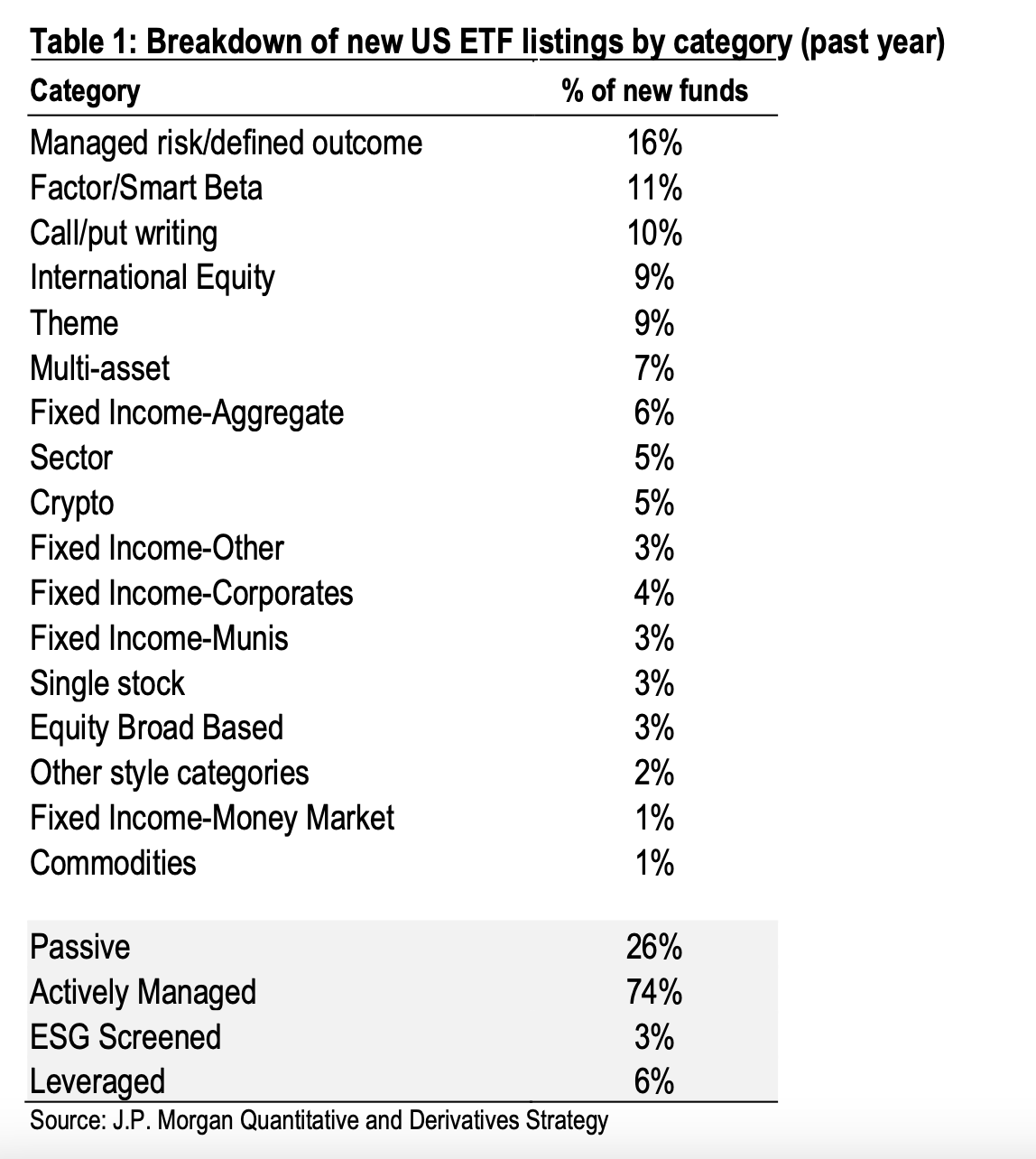 “...For the fourth consecutive year, the majority of new ETFs are actively managed. Additionally, risk-managed/defined, factor, call/put-written and thematic funds remained significant areas of interest for issuers over the past year, together accounting for nearly half of all new ETF issues. Cryptocurrency ETFs have been another major area of interest over the past year; they have accounted for approximately 5% of new fund issues and have attracted over 40% of AUM in newly issued funds.”