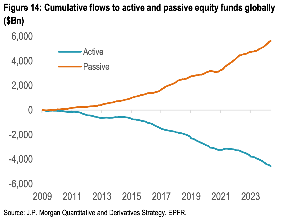 As JPMorgan points out, this isn’t really making a dent in the broader shift toward passive investment strategies — whether in mutual funds or ETFs. Rather, active ETFs are only slightly eroding the market share of the mutual fund structure